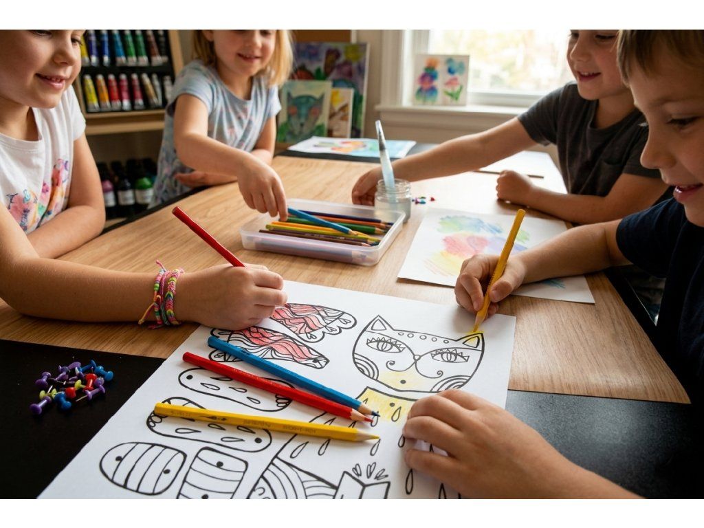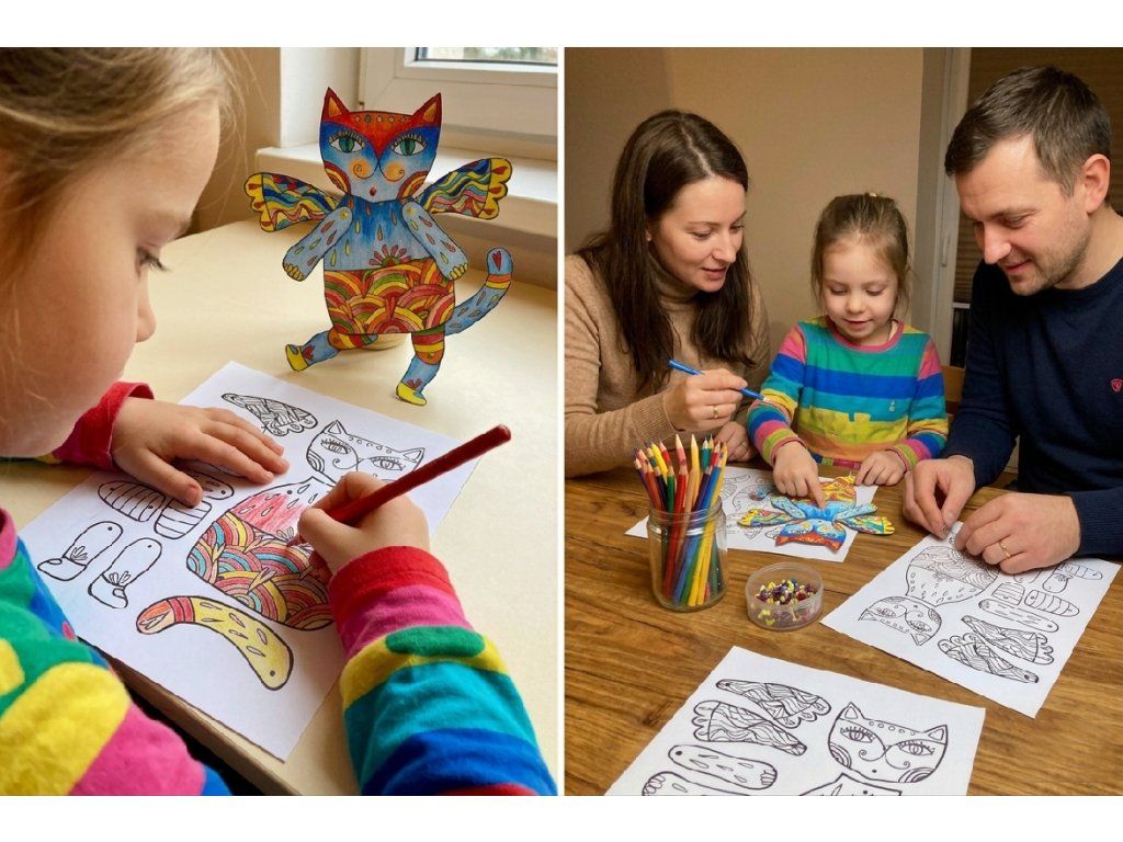 Barevná kočka? No jistě! Jakou barevnost zvolíte je jen na vás. Vybarvovat můžete obyčejnými i akvarelovými pastelkami, fixem i voskovkami. Pohyblivé části spojíte brads sponami, které jsou součástí balení.