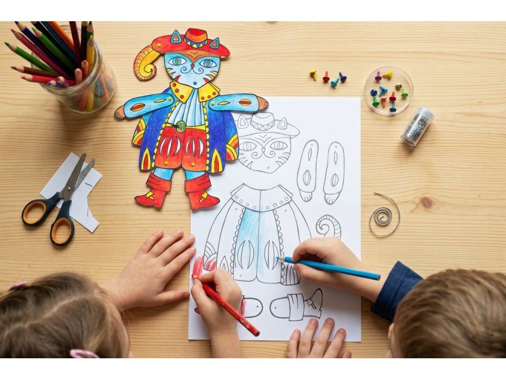 Kocour gentleman. V botách. Jakou barevnost zvolíte je jen na vás. Vybarvovat můžete obyčejnými i akvarelovými pastelkami, fixem i voskovkami. Pohyblivé části spojíte brads sponami, které jsou součástí balení.