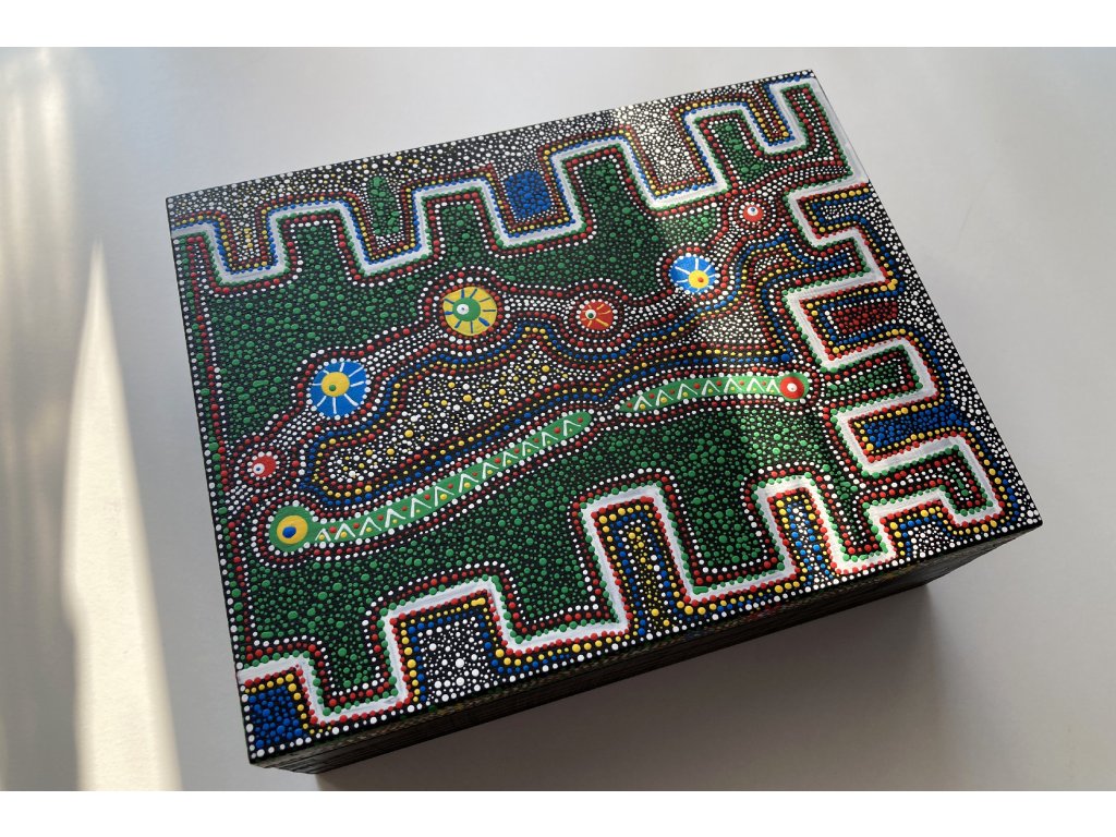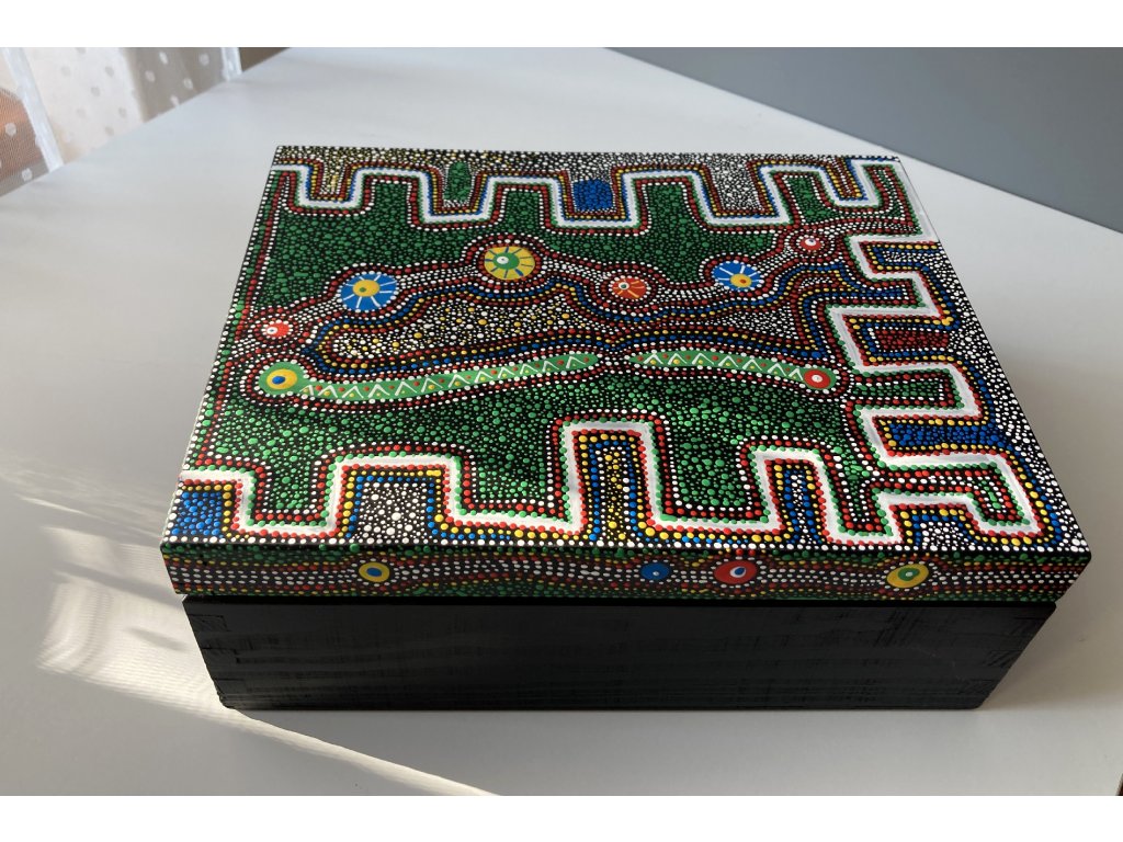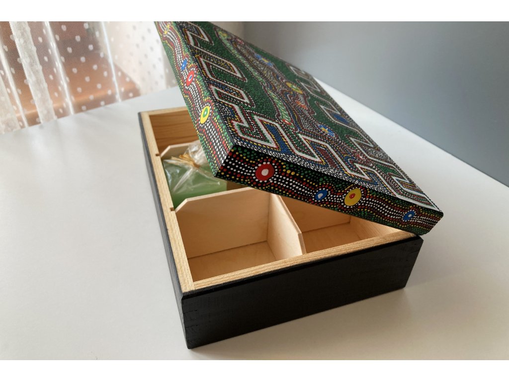 Dřevěná krabička s víkem jako obrázkem. Do šesti vnitřních přihrádek můžete uložit, co vám vyhovuje - čaje, šperky, drobnosti...