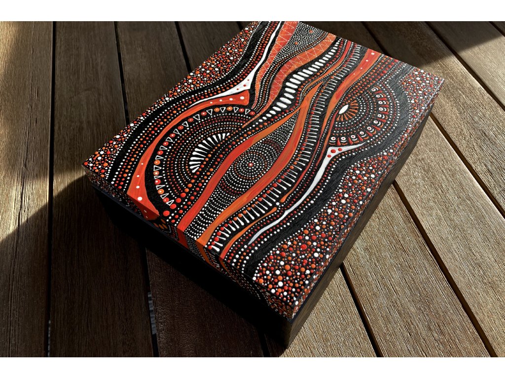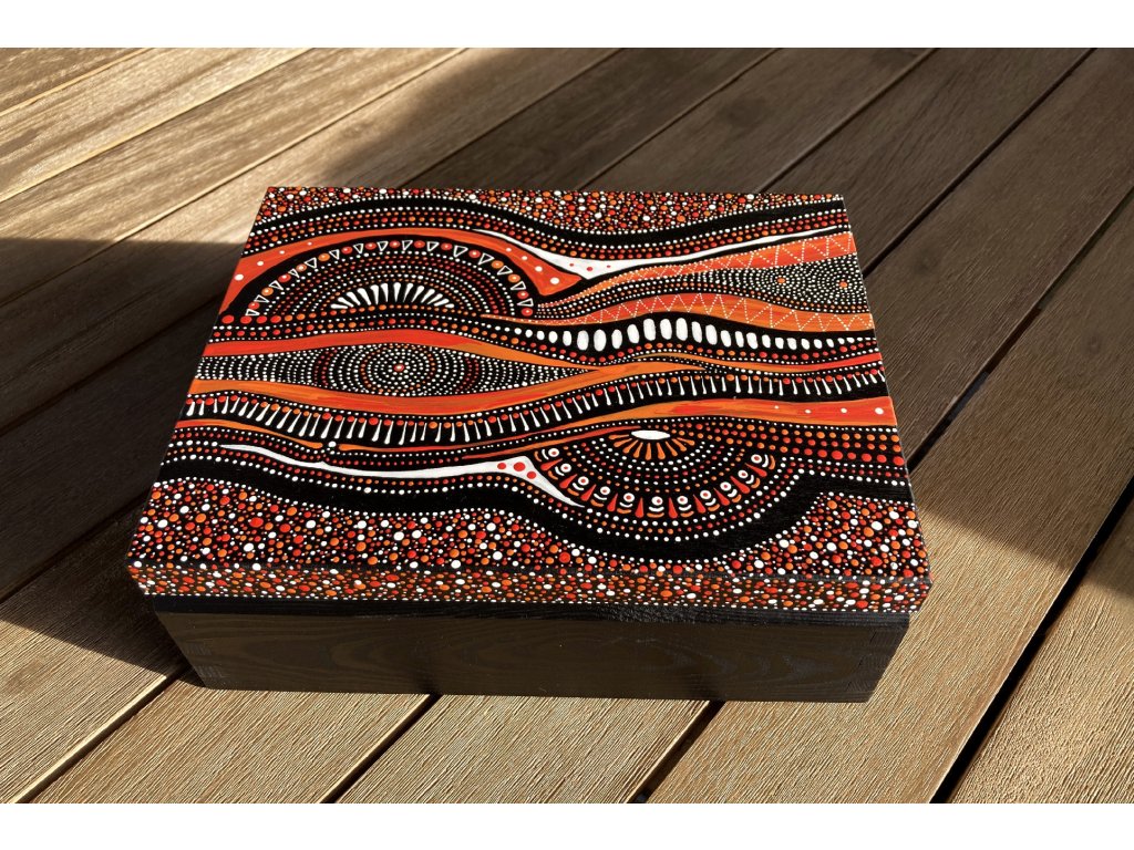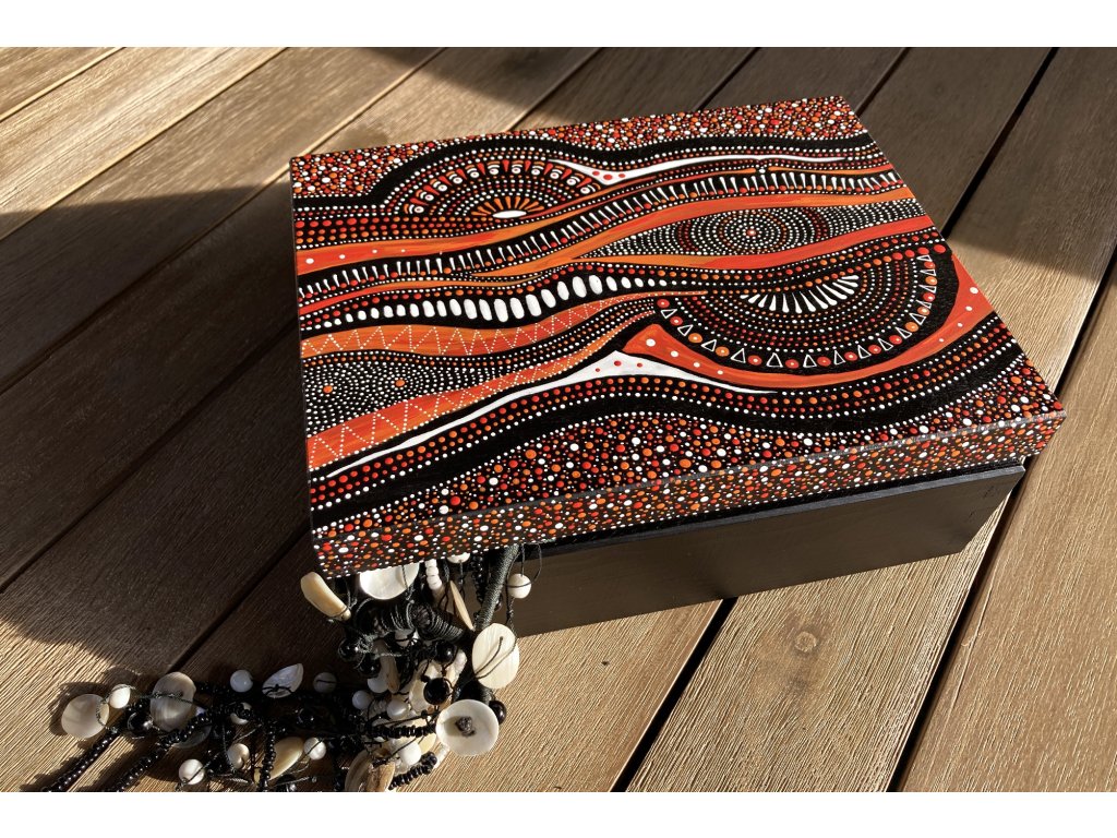 Dřevěná krabička s víkem jako obrázkem. Do šesti vnitřních přihrádek můžete uložit, co vám vyhovuje - čaje, šperky, drobnosti...